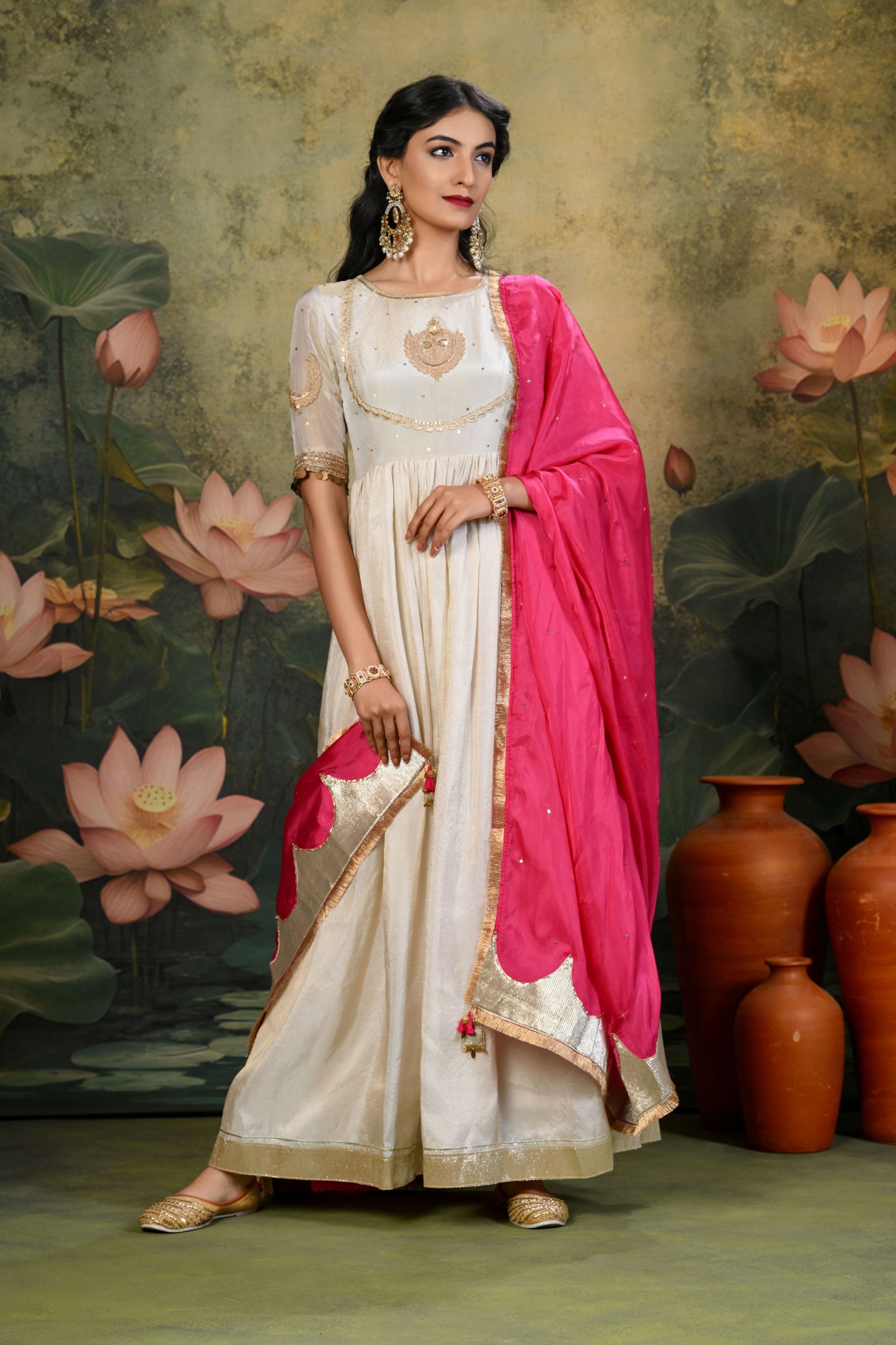 This ivory and gold ensemble gets a vibrant update with a magenta pink dupatta finished with gota & tassel detailing. The classic silhouette and neckline detailing make it perfect for wedding rituals or festive soirées. Just add chandbalis and gold mojaris to complete the regal vibe.