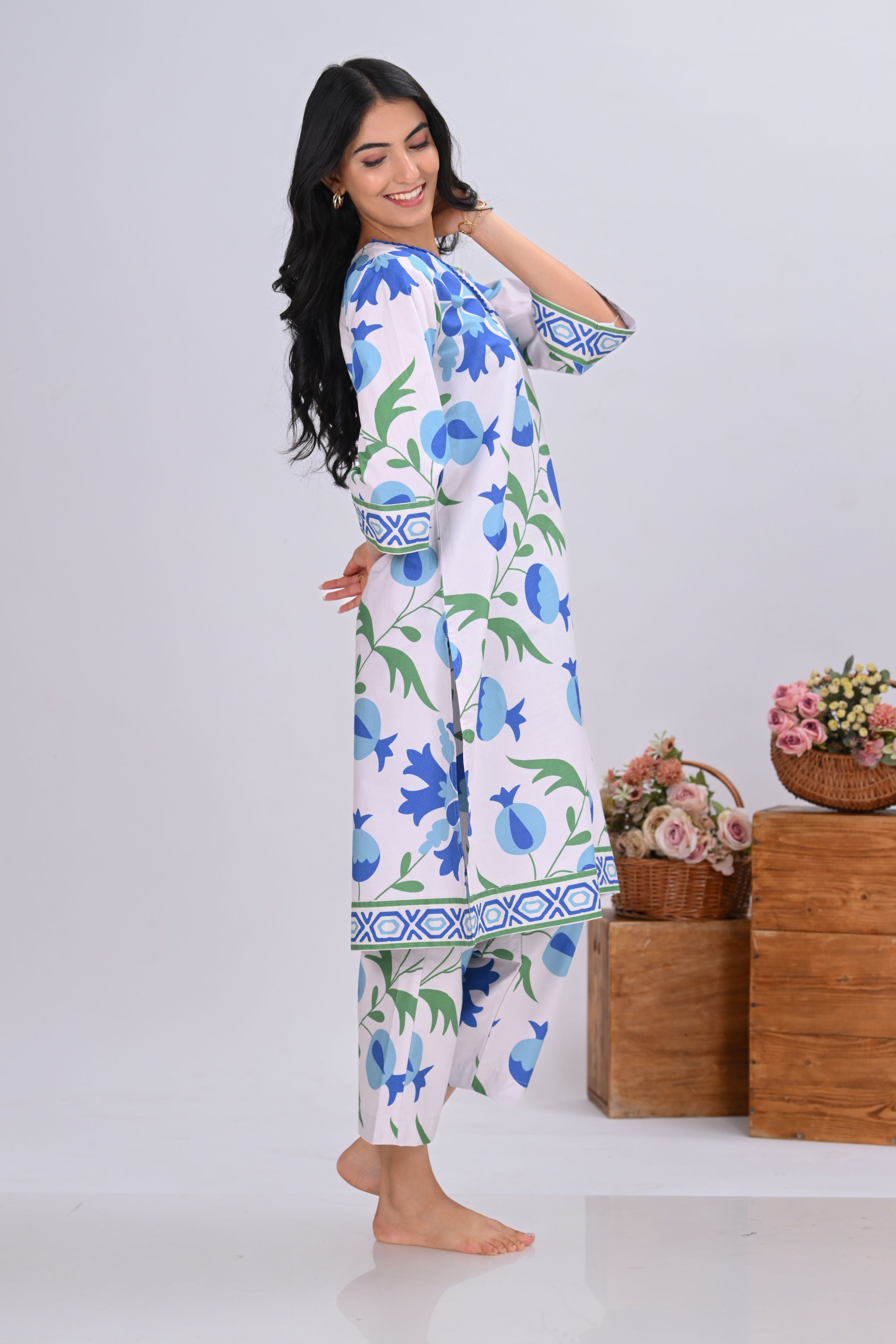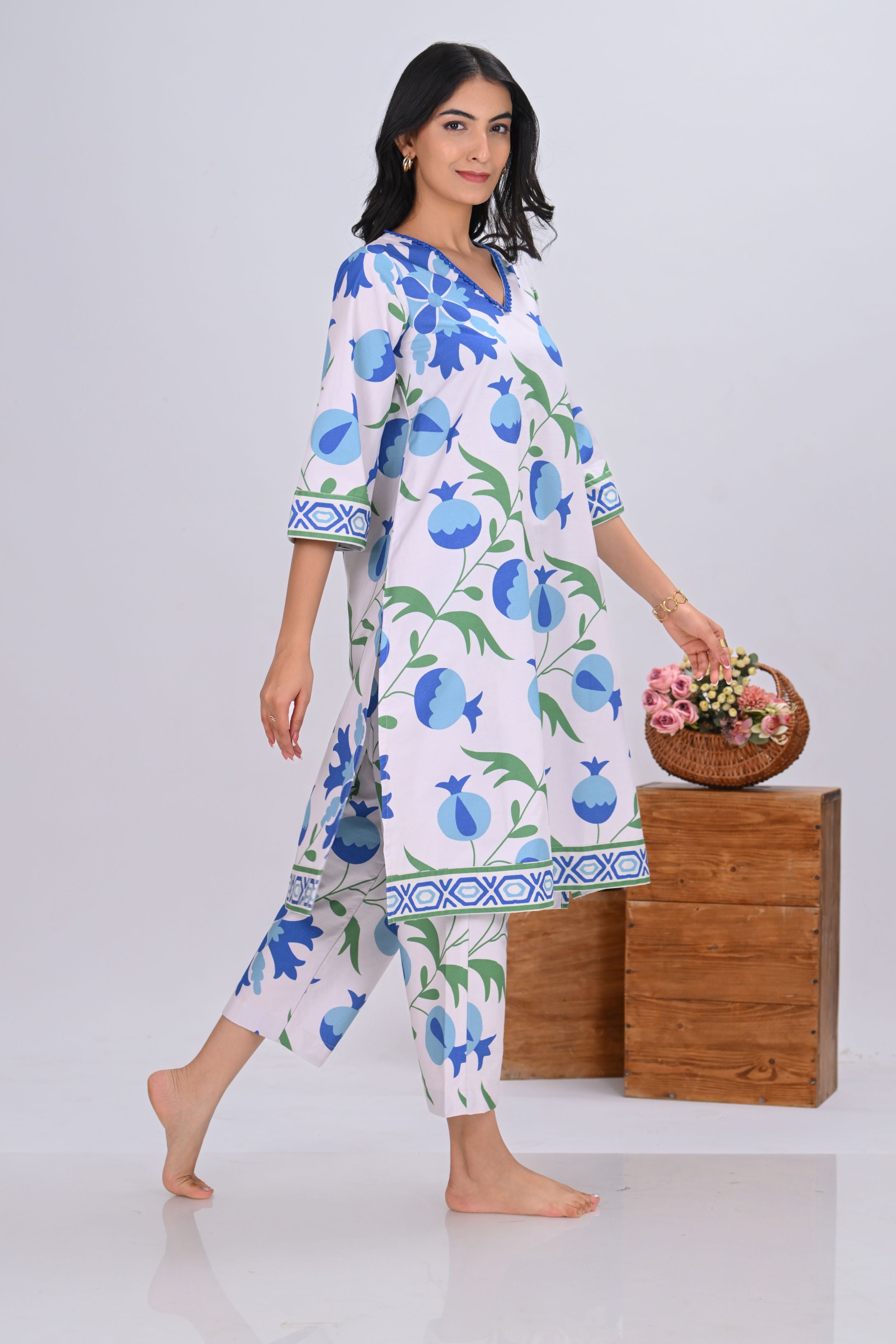 With its timeless bold print pattern and breezy construction, this co-ord set is your go-to for everyday comfort with flair. The easy V-neck and elbow sleeves make it ideal for long days. It’s perfect for casual catch-ups, weekend brunches, or even a laid-back office look.