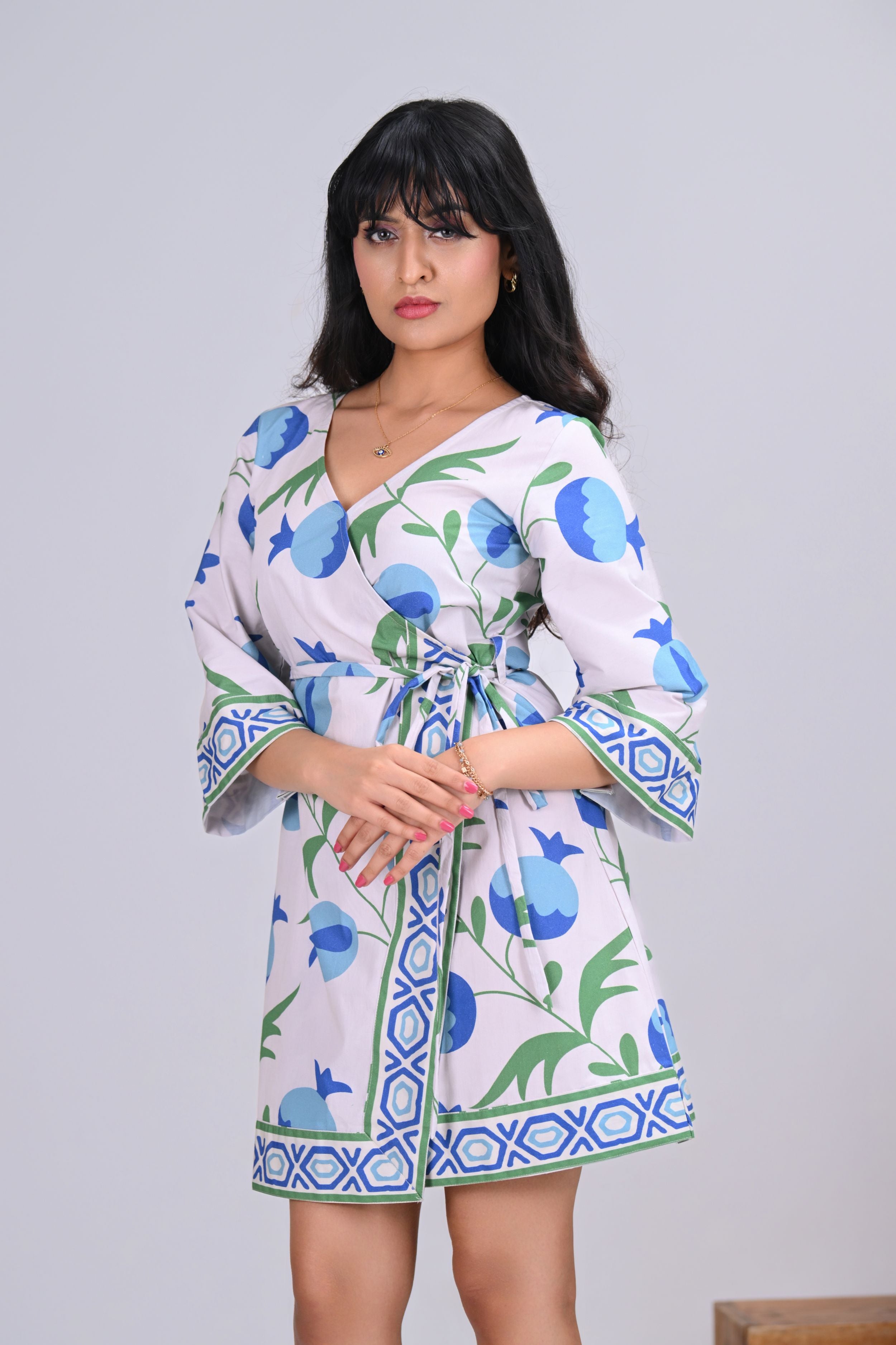 A fresh take on daytime dressing, this wrap-around dress blends playful charm with ease. The bold print adds vibrance, while the V-neckline and relaxed silhouette keep it effortlessly stylish.