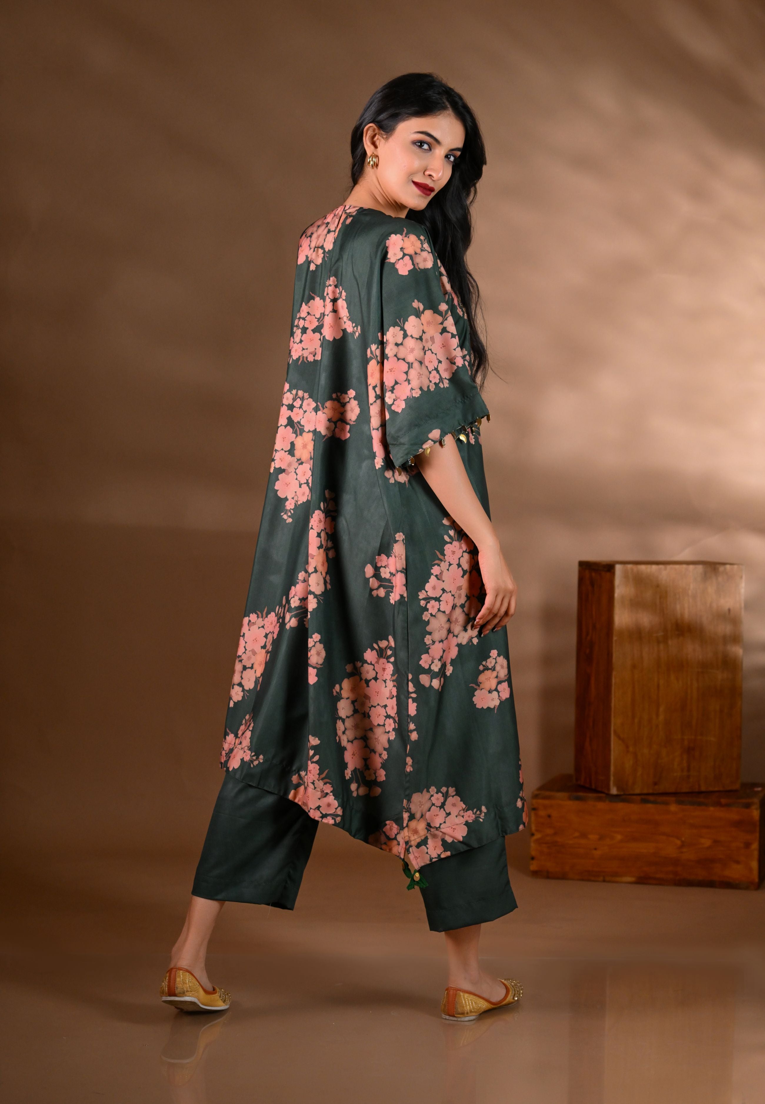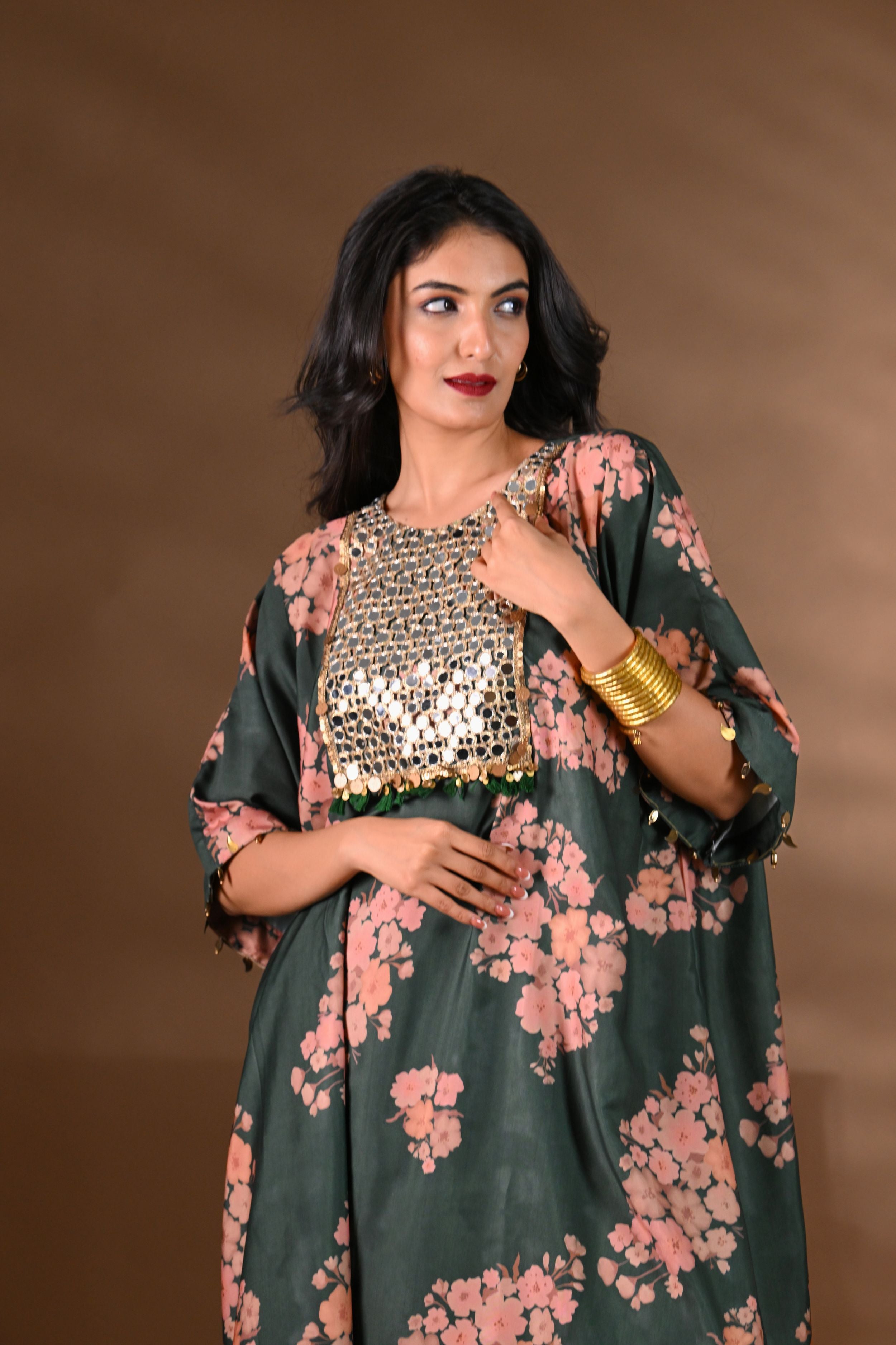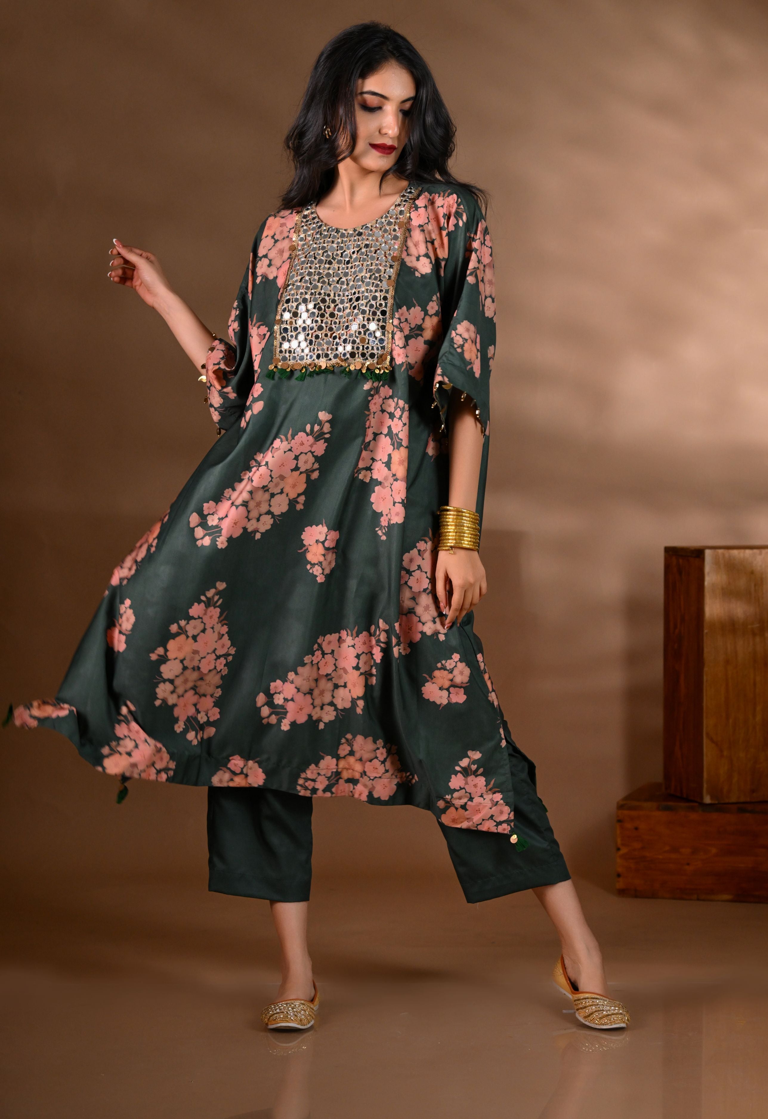 Earthy meets elegance — this green kurta set is elevated with pink floral & bird motifs prints and a dazzling mirror-work yoke. The asymmetric hem adds flow to your festive moves. Great for every festive & wedding celebration.