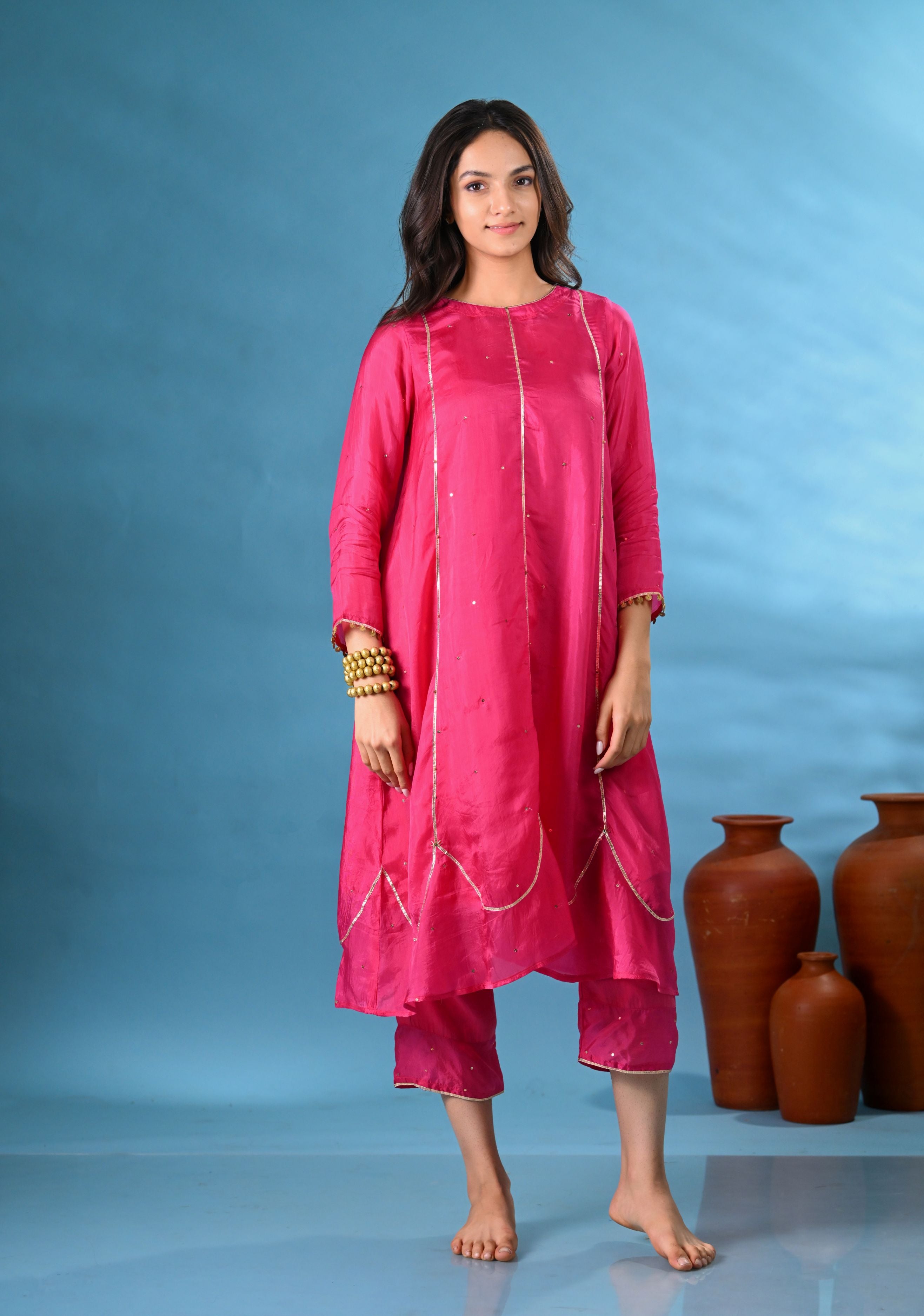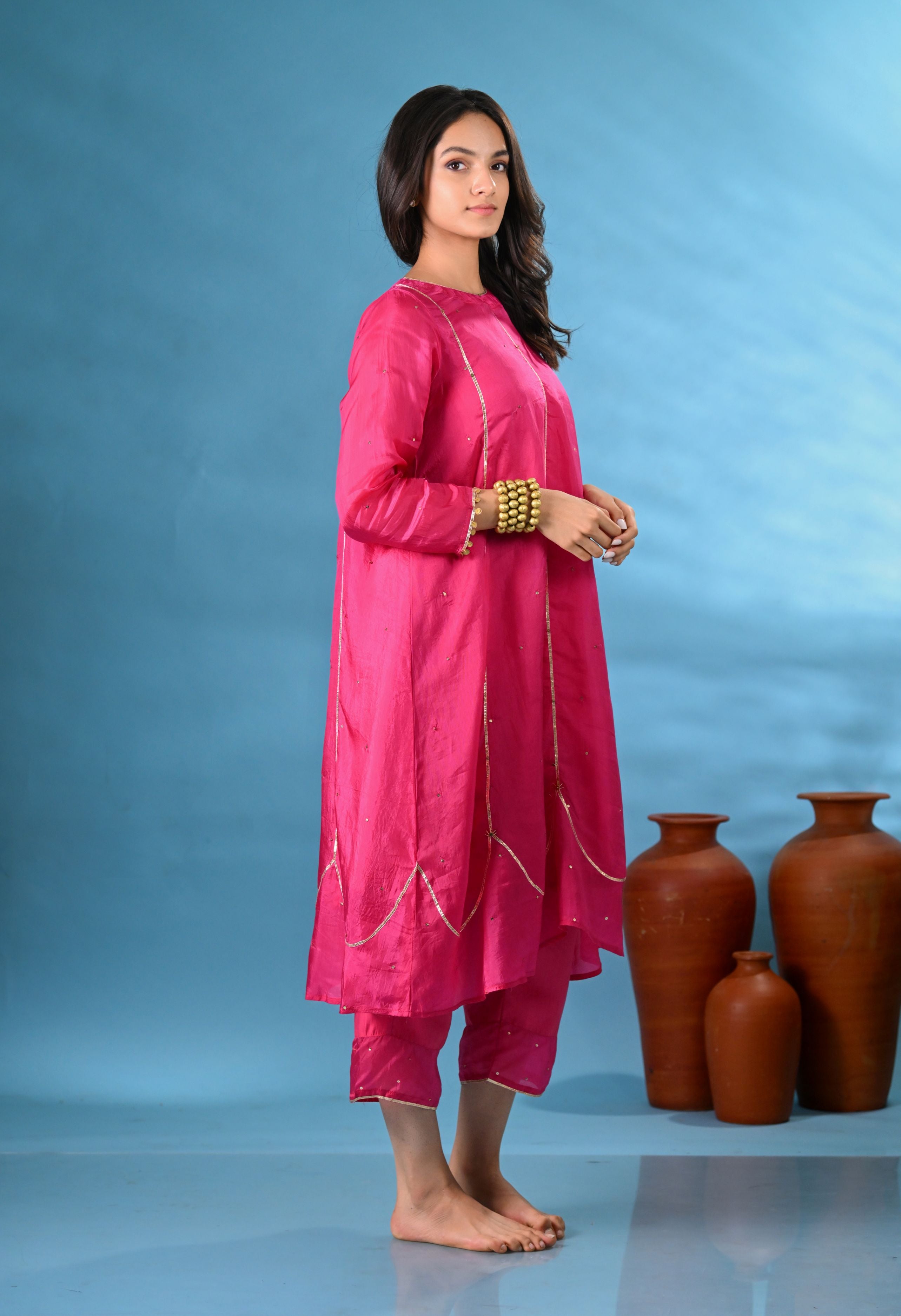 Designed for effortless elegance, this magenta ensemble features A-line kurta with minimalistic hand detailing and gota work. The simplicity of the silhouette is balanced by the rich, saturated colour - making it perfect for casual festive gatherings or an elevated everyday ethnic look.