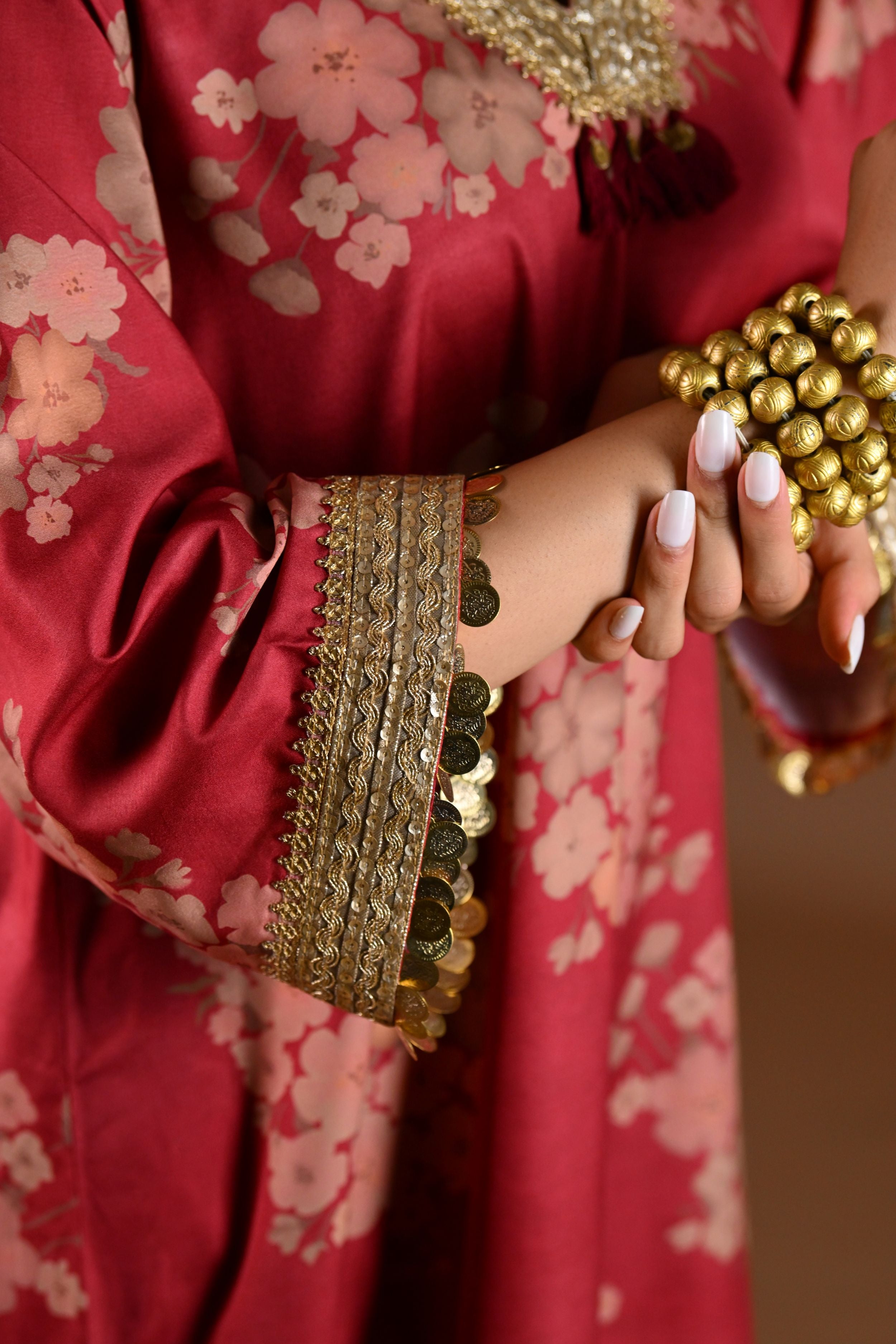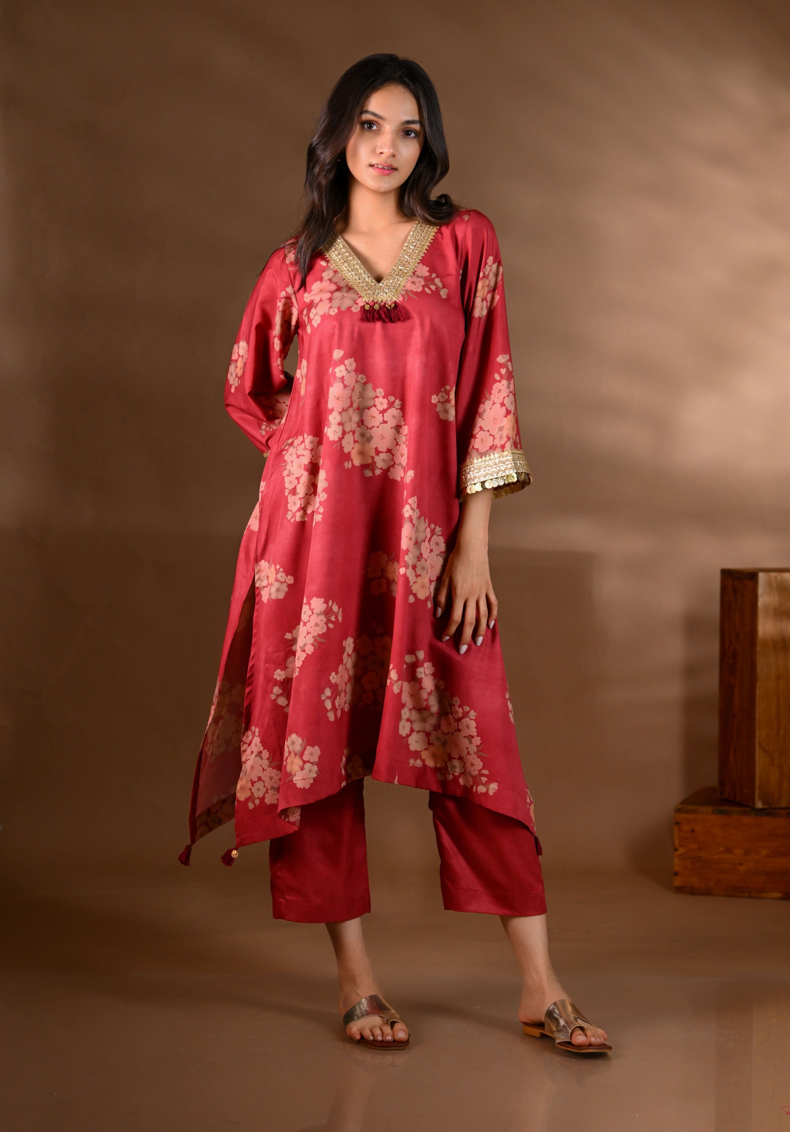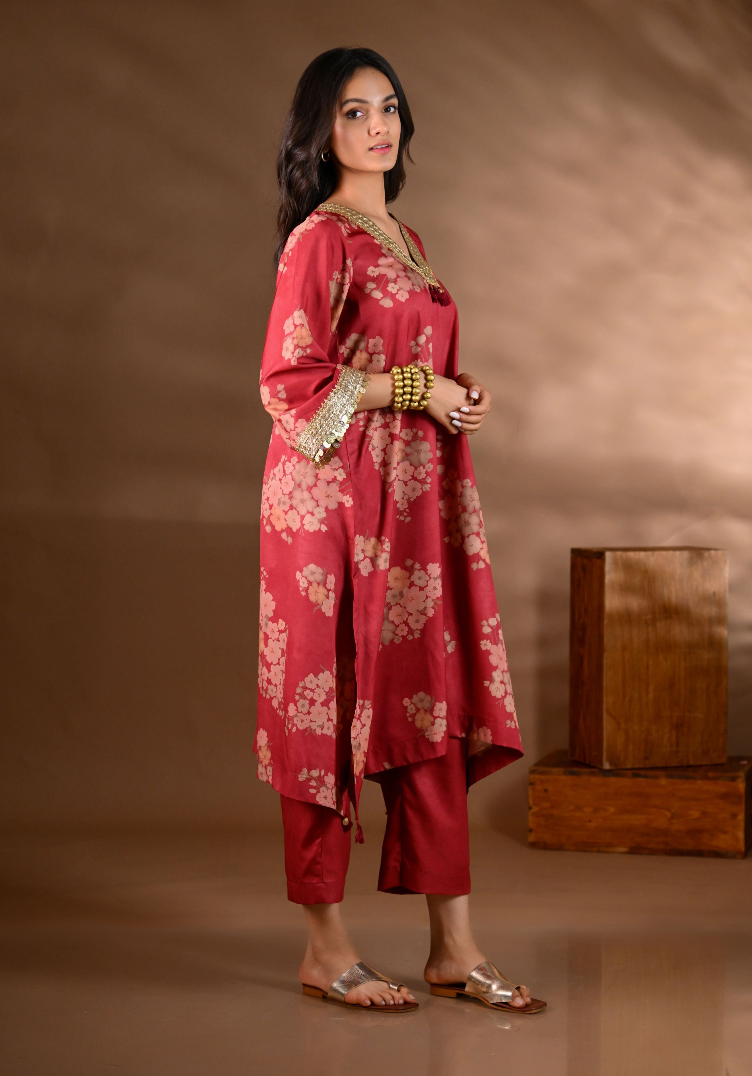 Classic meets contemporary in this rich red kurta set featuring blush-toned florals & bird print and handcrafted gold coin-detailing sleeve cuffs. The soft sheen of the fabric paired with a flowy fit makes it perfect for daytime festivities, pujas. Pair with golden earrings and soft waves for a feminine, festive finish.
