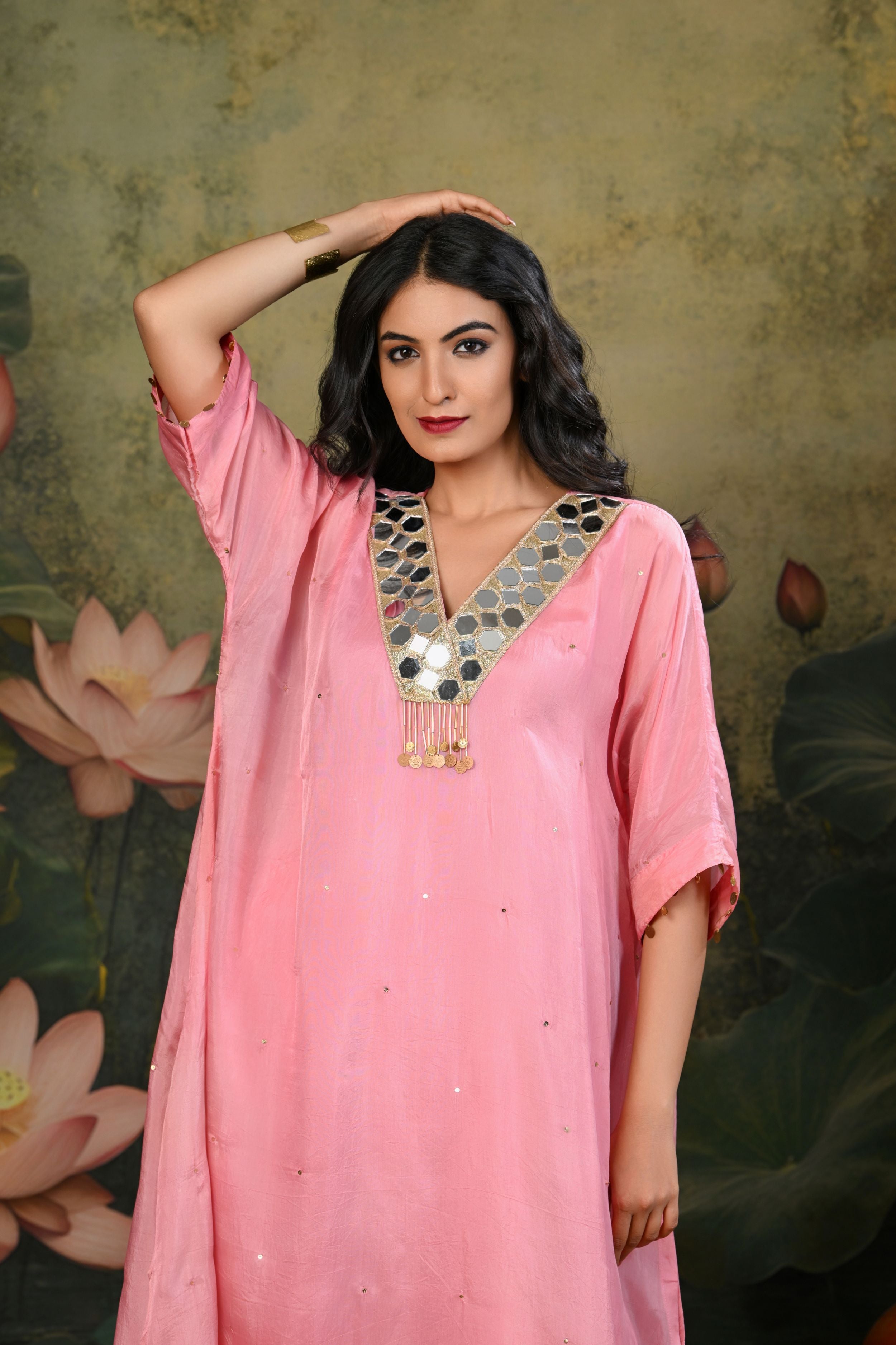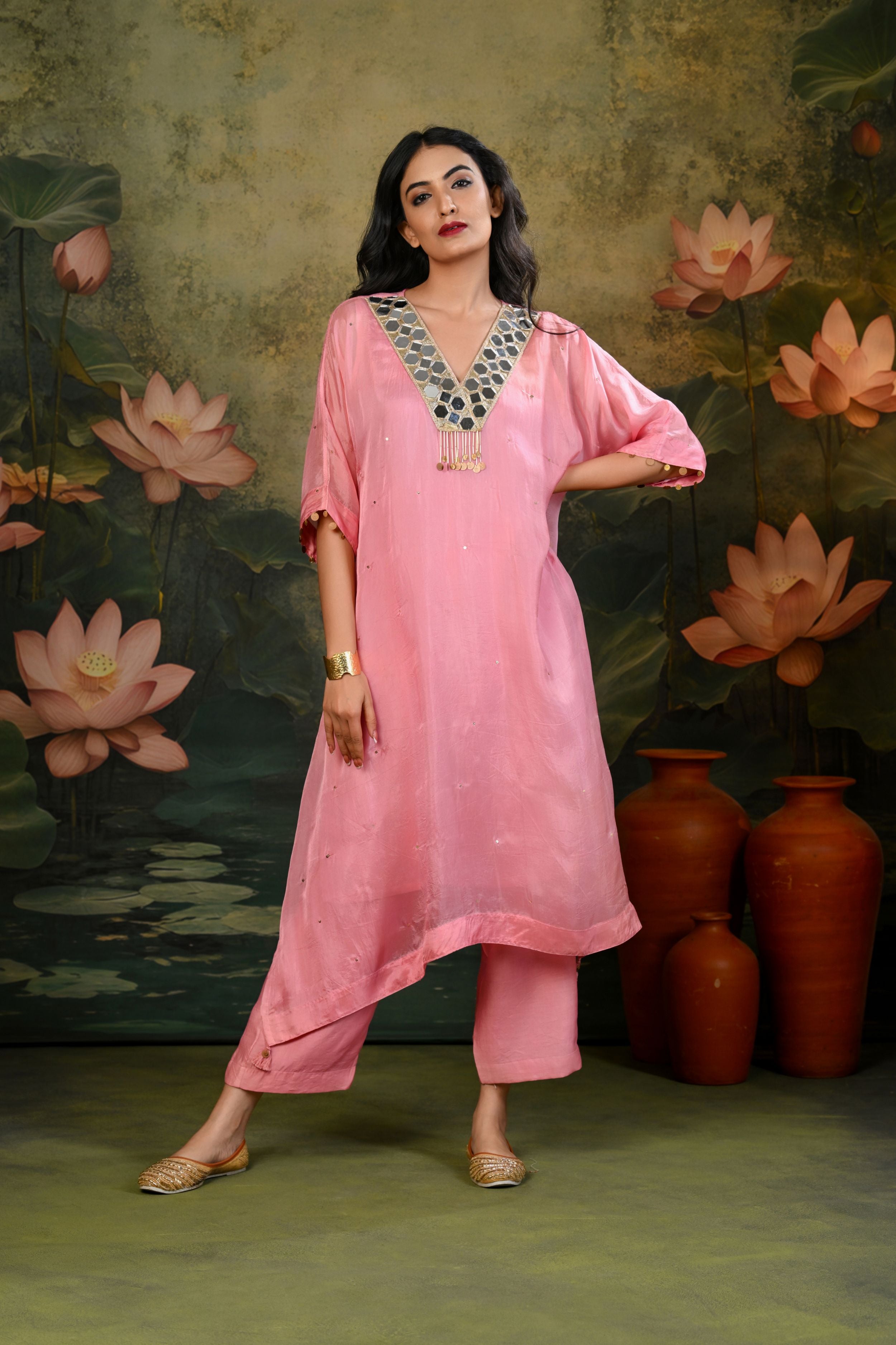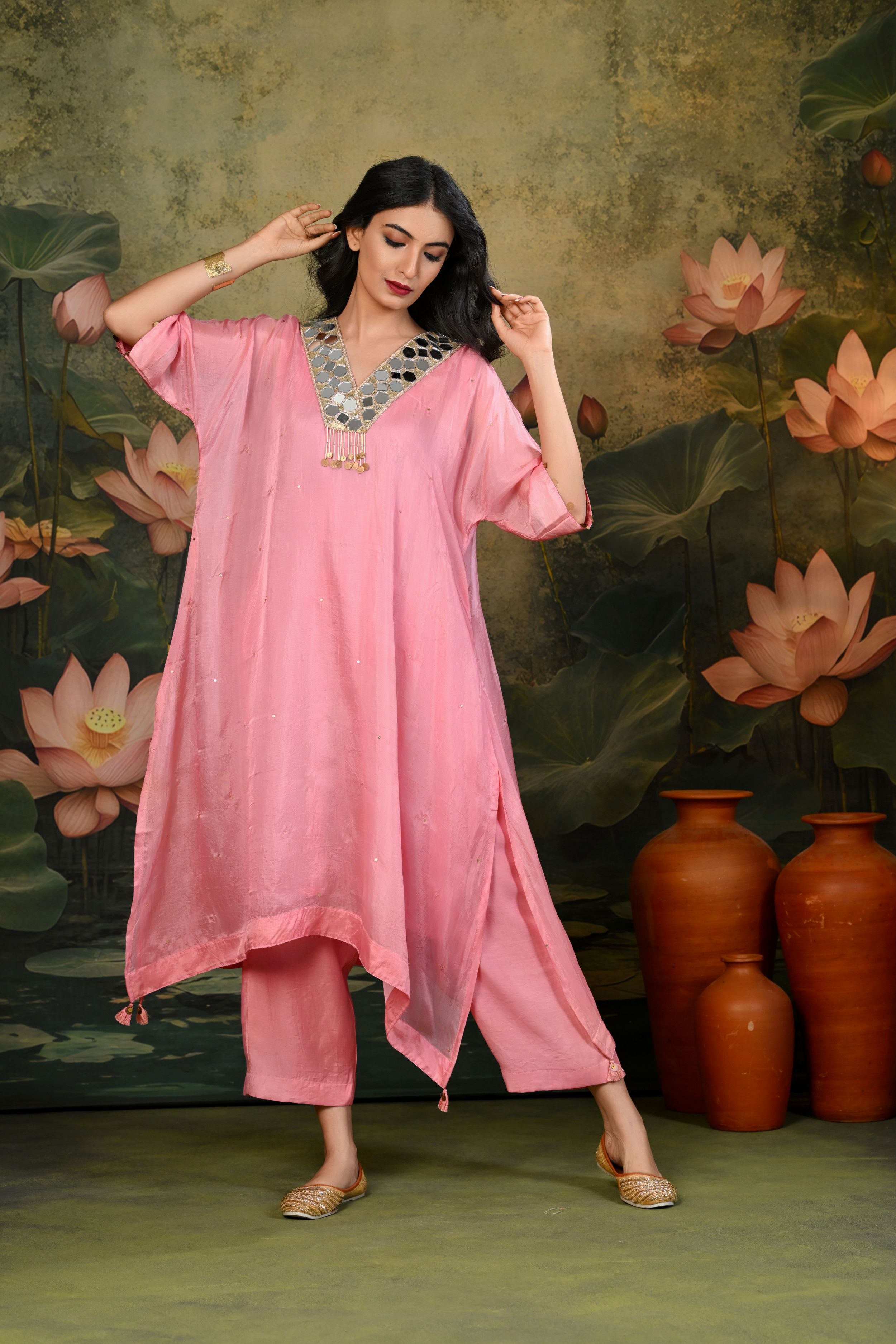 Feminine and floaty, this blush pink set features a soft asymmetric hem and shimmering mirror work embellished V-neck with handwork detailing along the yoke. It’s the kind of look that pairs effortlessly with festive flats and floral jewelry for a mehendi , haldi event or any fesive celebration.
