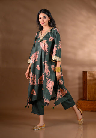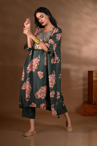 Green Crepe Printed Mirror-work Yoke Kurta Set (Set of 2)
