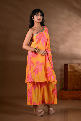 Yellow Crepe One-Shoulder Mirror-Work Kurta Set