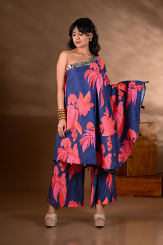 Blue Crepe One-Shoulder Mirror-Work Kurta Set
