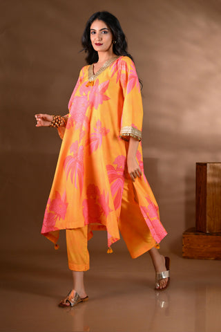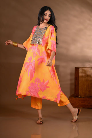 Yellow Crepe Printed Mirror-work Yoke Kurta Set (Set of 2)