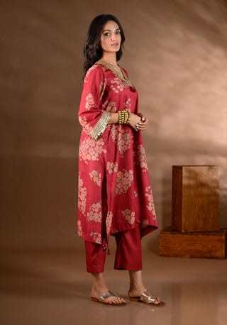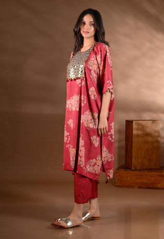 Red Crepe Printed Mirror-work Yoke Kurta Set (Set of 2)