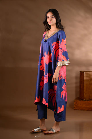 Blue Crepe V-Neck Coin Detailing Kurta Set (Set of 2)