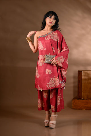 Red Crepe One-Shoulder Mirror-Work Kurta Set