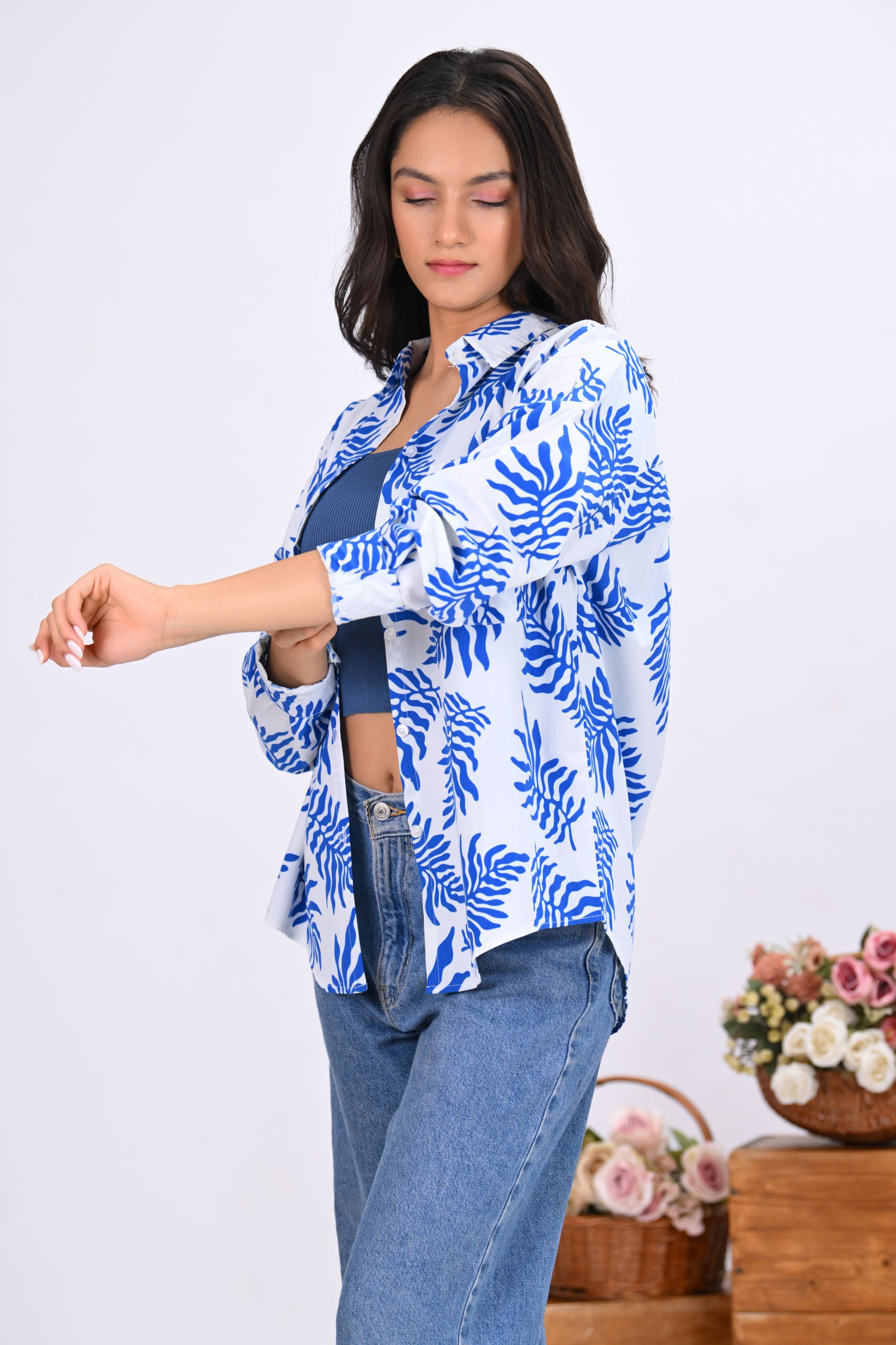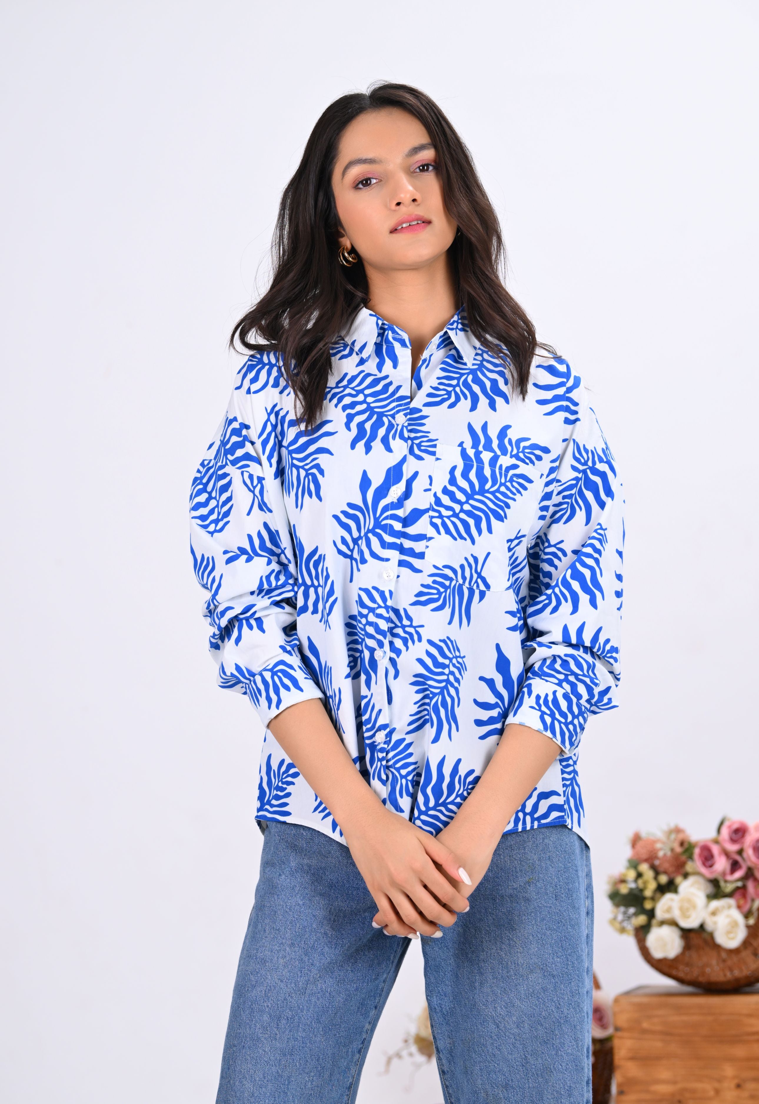 Bring cool, coastal energy to your closet with this oversized shirt featuring a crisp blue leaves print. Cut from soft, breathable cotton poplin, it’s designed for comfort and style that lasts all day. Pair it with anything from cutoffs to wide-leg trousers — your vibe, your rules.