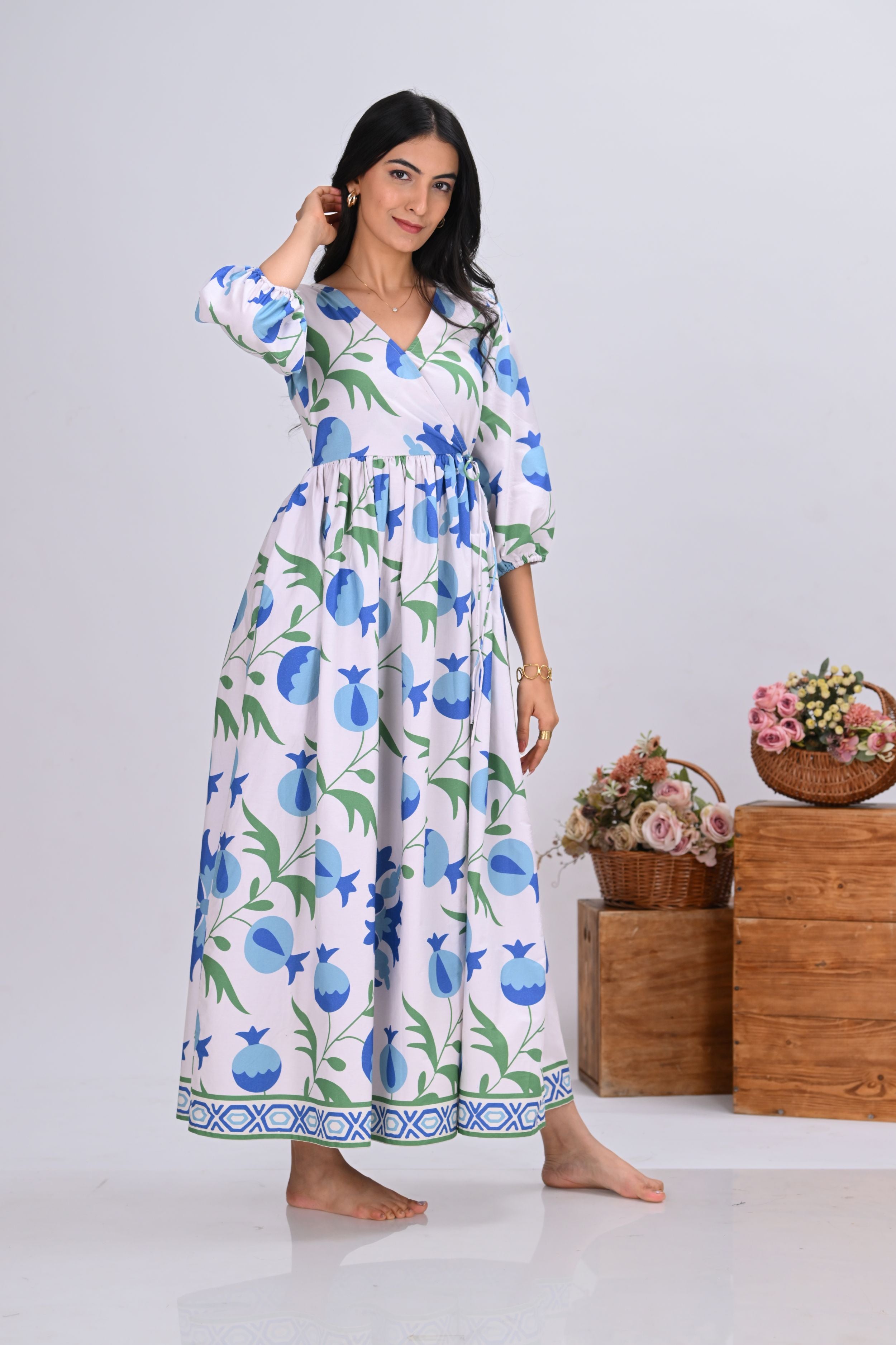 Blue & Off-White Pomegranate Print Wrap-Around Maxi Dress