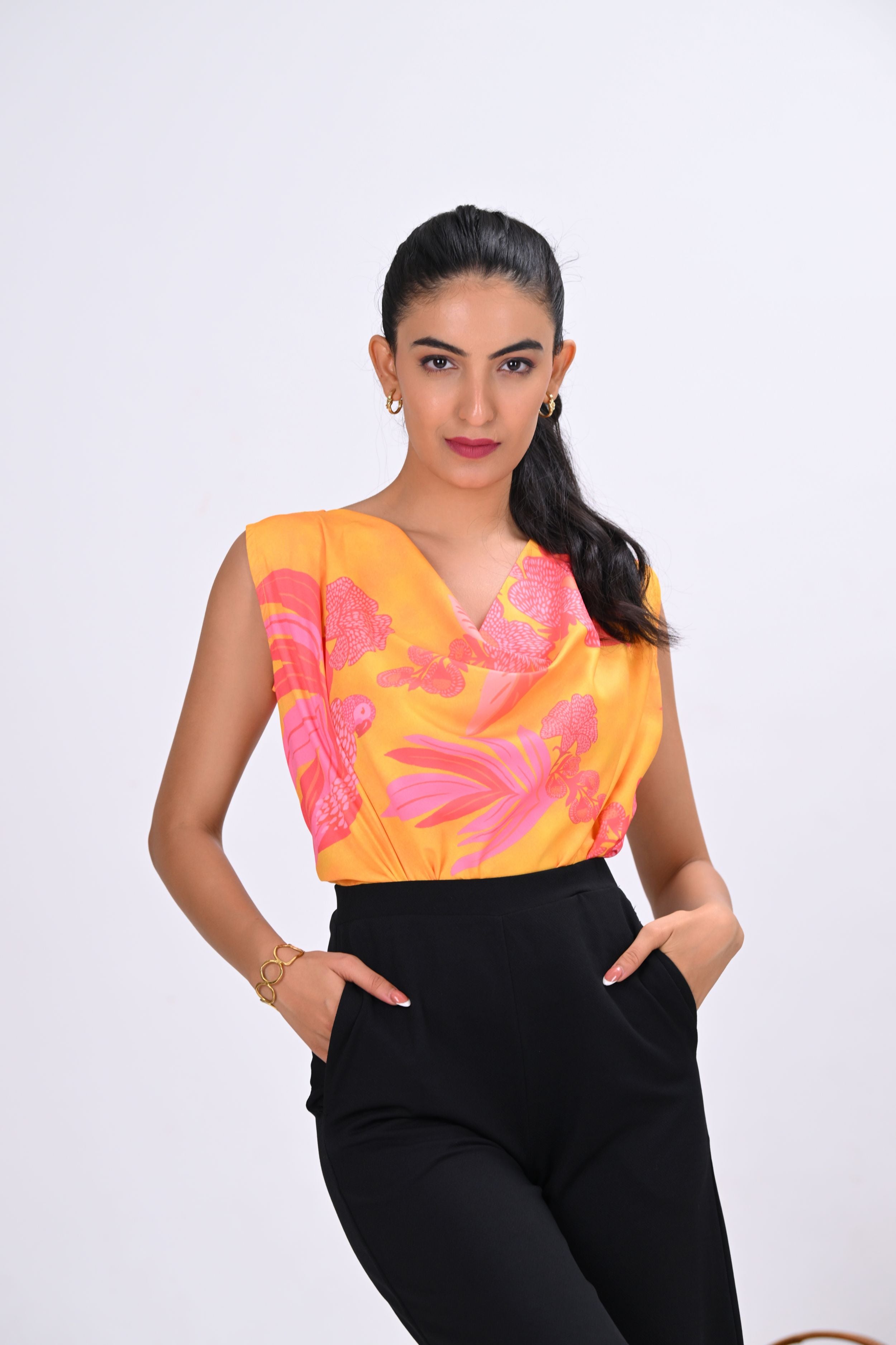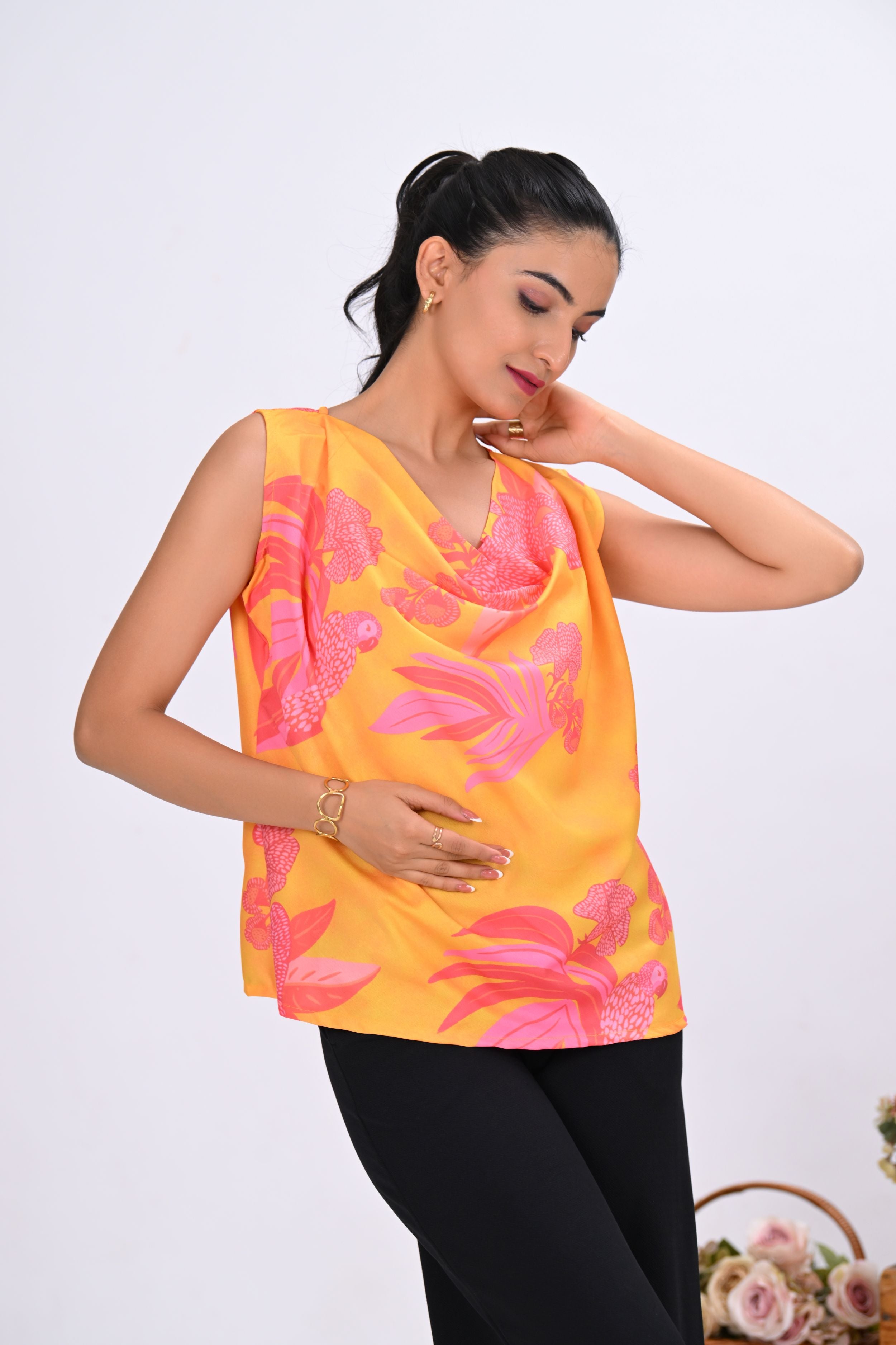 Feminine and fluid, this vibrant cowl neck top crafted in soft crepe fabric. The sleeveless silhouette, adorned with bold pink print on a yellow base adds a pop of colour to your wardrobe. Whether paired with tailored trousers for work or styled casually with denims, this versatile piece transitions seamlessly from day to night.