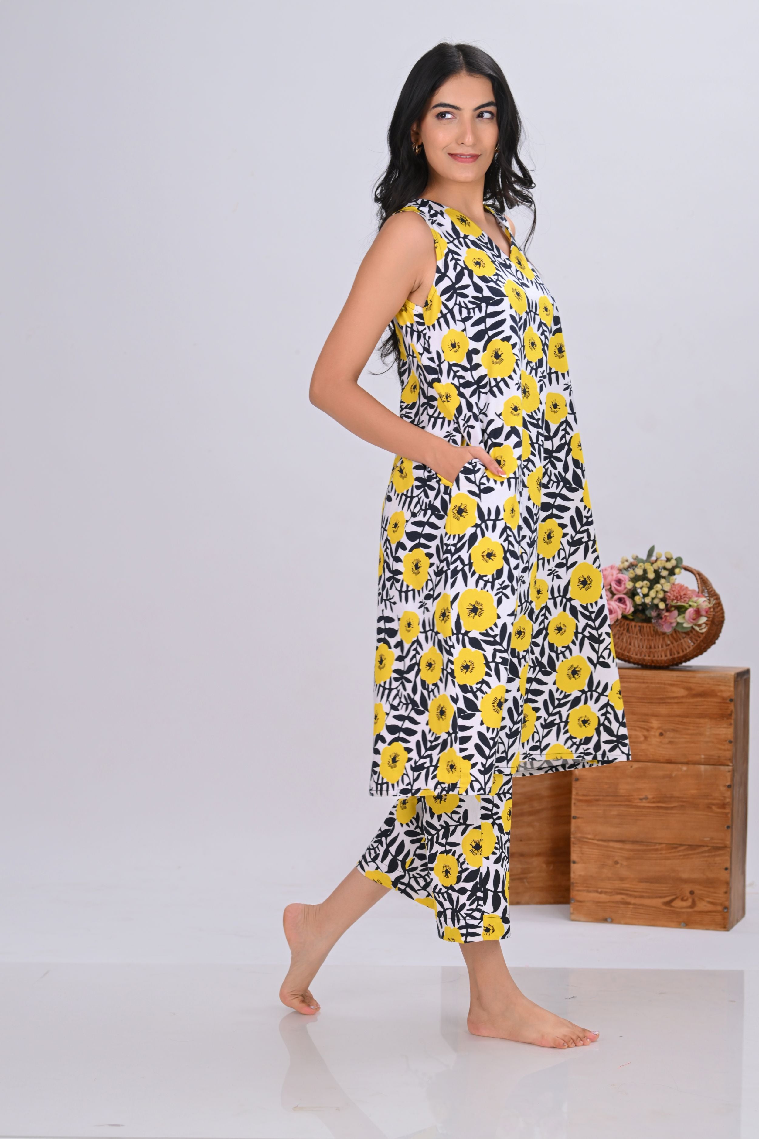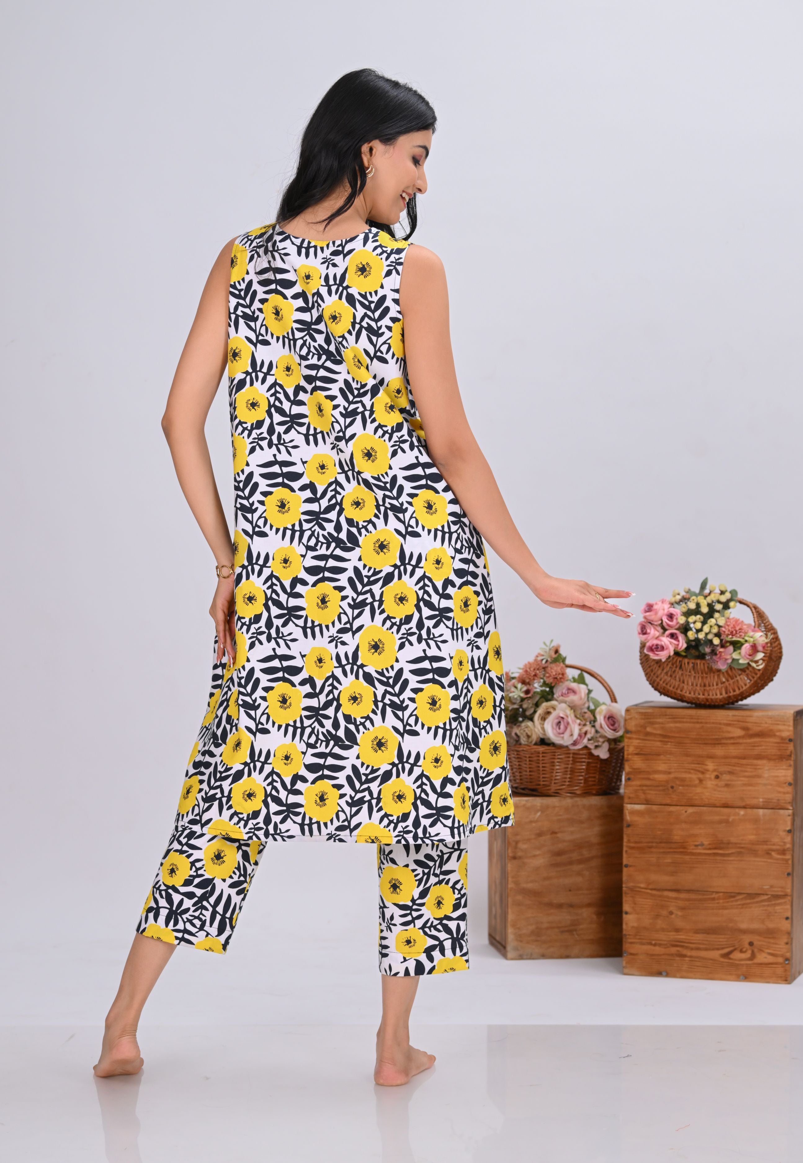 Black & Yellow Floral Print Sleeveless Co-ord Set (Set of 2)