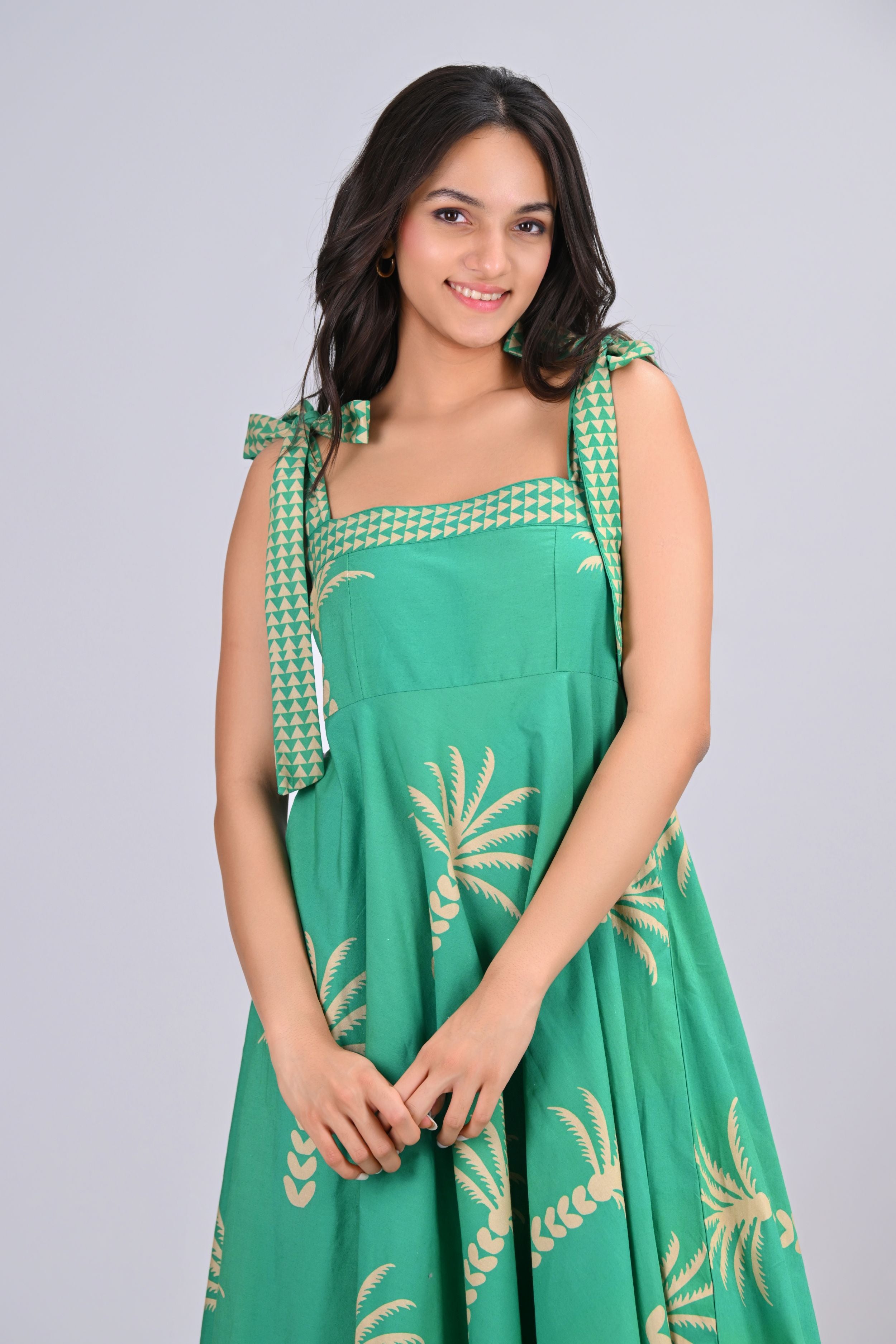 Breezy and effortlessly chic, this maxi dress with adjustable shoulder ties makes for a playful wardrobe staple. The flowy cut and the whimsical palm print channels easy going beachside vibes. Whether you’re strolling a seaside promenade or heading to brunch in the city, this look brings a relaxed sense of resort style wherever you go.