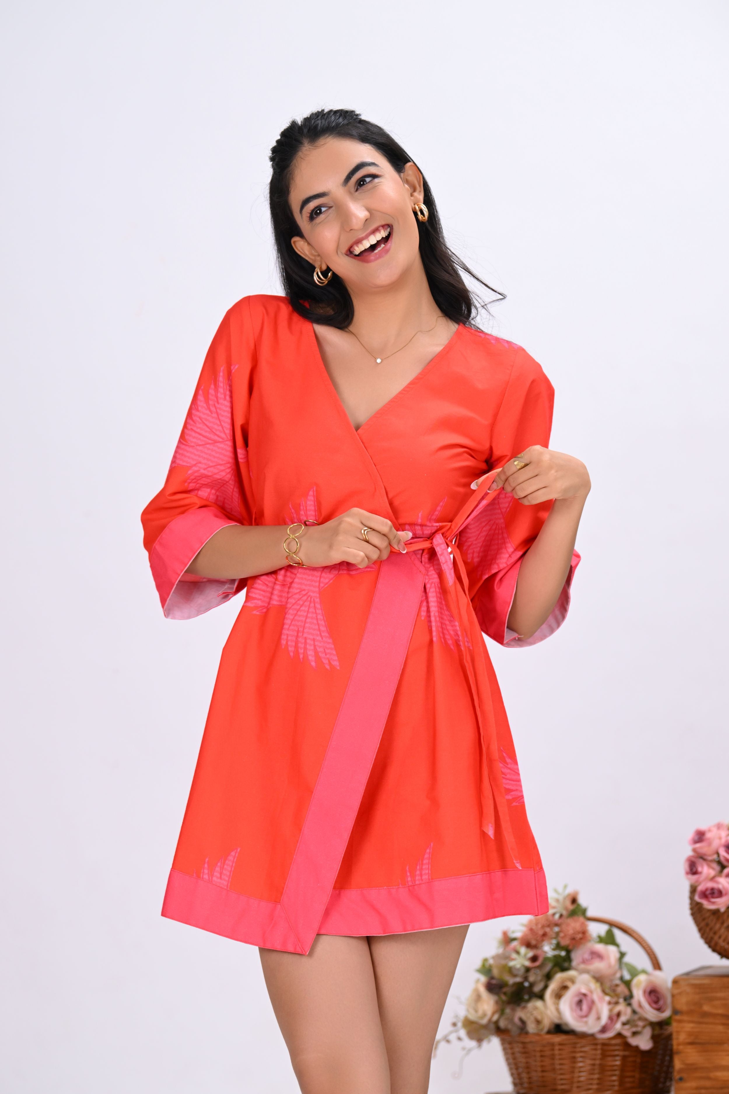 With a breezy silhouette and vibrant Orange & Pink Bird Print, this wrap-around mini dress is your go-to for effortless day dressing. Whether it’s a casual brunch or a creative workday, the flattering fit and bell sleeves add just the right touch of femininity to keep it versatile yet striking.